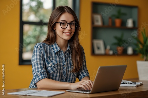 Portrait of lovely intelligent girl touch eyeglasses hold laptop coworking isolated on yellow color background