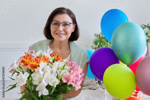 Portrait of middle aged happy woman with bouquet of flowers, balloons