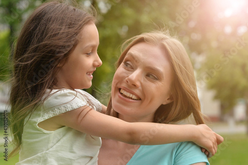 Portrait of mother and daughter hugging outdoors