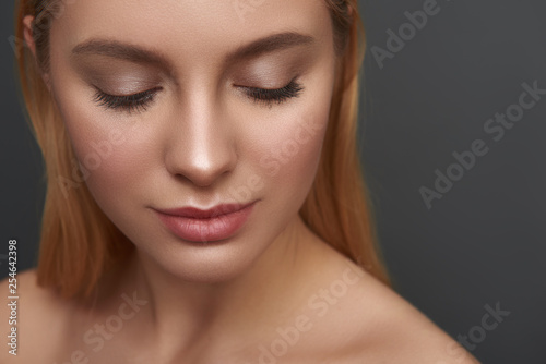 adult, alone, appearance, smiling, closeup, woman, female, young, youth, portrait, face, background, grey, isolated, beauty, beautiful, look, attractive, skin, natural, bare, shoulder, happy, glad, pleasure, pleasant, joy, smile, positive, joyful