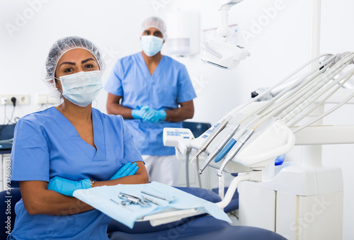 woman, female, dentist, dentistry, dental, office, clinic, stomatologist, healer, practitioner, doctor, specialist, assistant, dentistry, medicine, service, health, health care, wellness, beauty, hygiene, portrait, indoor, people, adult, ethnicity, hispanic, latin, profession, work, engagement, activity, occupation, emotion, experienced, competence, positive, successful, smiling, uniform, blue, arm, crossed, equipment, drill, chair