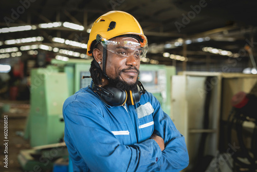 Portrait of smiling African American industrial engineer worker wearing safety helmet and uniform standing with arms crossed in industry manufacturing factory in the background and looks other way.