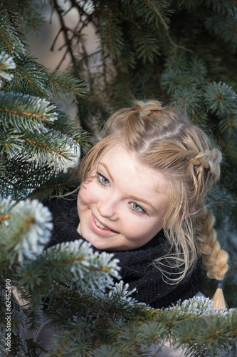 fir tree, tree, cold, blond, face, female, park, on, white, evergreen, wood, people, serene, caucasian, ice, closeup, smiling, fir, portrait, season, woman, pine, forest, cool, needle, winter, plant, hair, girl, frost, background, coniferous, tree branch, nature, environment, walk, posing