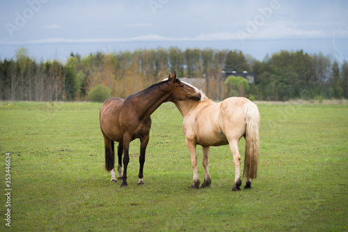 Portrait of two horses. Brown and beige horses. Bay and Palomino equine coat color. Farm animals on green hay field. Green pasture on spring day. Estonia, Baltic, Europe.