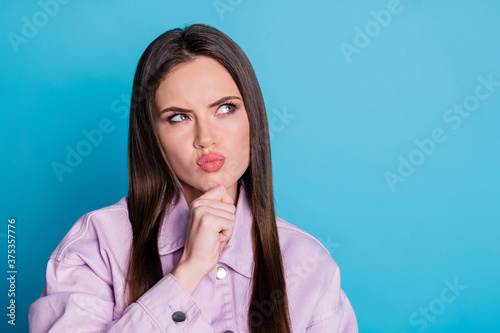 Portrait of unaware minded girl look copyspace touch finger chin think thoughts cant decide choose decision choice wear casual style clothes isolated over blue color background