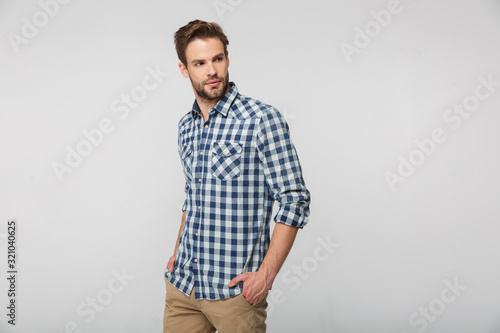 man, male, calm, serious, model, attractive, white, pocket, hand, copy space, portrait, shirt, young, wall, bristle, optimistic, caucasian, photogenic, guy, isolated, casual attire, background, 1, indoor, studio, masculine, unshaved, bearded, plaid, alone, confident, satisfied, looking, brutal, beautiful, posing, good-looking, standing, successful
