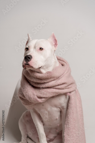 Portrait of white pitbull terrier in a pink scarf sitting in front of white background. Cool dog. Dog has a sick throat. Copy space