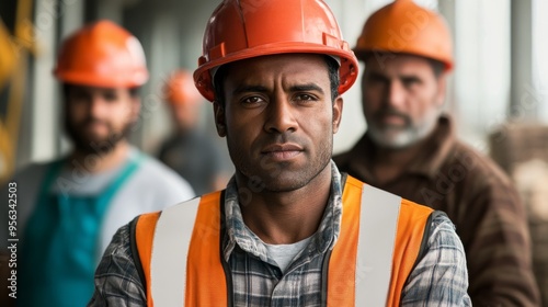 Portrait of workers wearing helmets in diverse group of team on construction site.