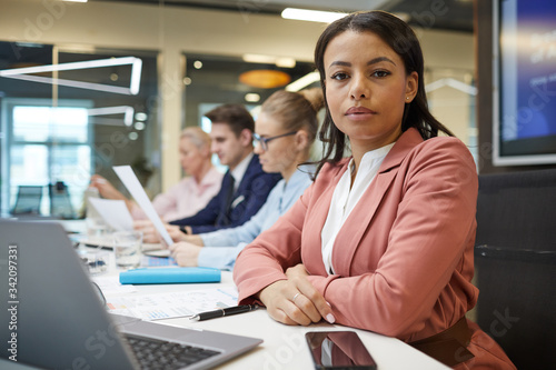 Portrait of young African businesswoman sitting at the table in front of laptop and looking at camera during business meeting at office