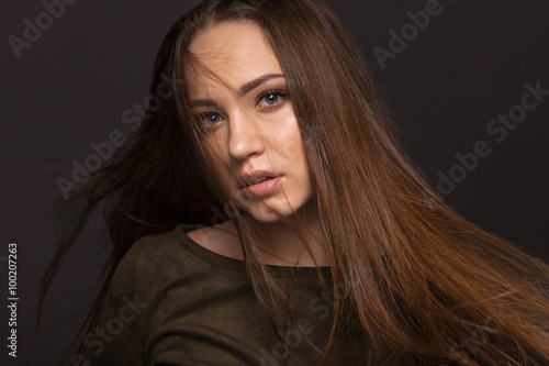 portrait, one person, female, young, beautiful, beauty, black, brown, brunette, make-up, blue eye, teenage, style, fashion, simple, grey background, care, caucasian, curly, cute, eye, face, girl, grace, hair, coiffure, head, human, lip, long, luxury, make-up, model, people, salon, sensuality, shiny, skin, studio
