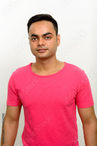 Portrait of young handsome Indian man against white background
