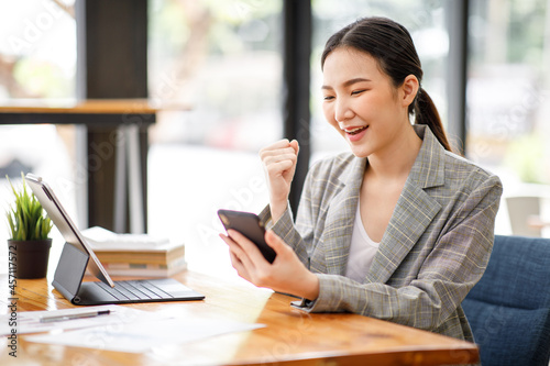 Portrait of young Happy excited asian businesswoman in office working with mobile phone,Yes great job.