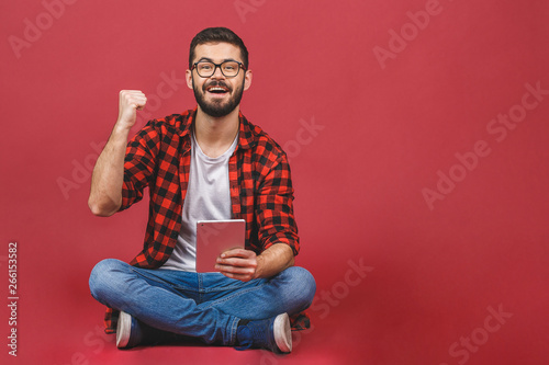 Portrait of young man sitting on the floor using a tablet pc, isolated against red background. Ready for your design.