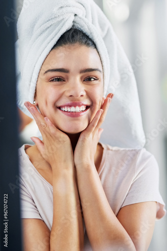 portrait, skincare, glow, woman, home, happy, smile, person, bathroom, confident, skin, care, wellness, towel, mirror, treatment, proud, soft, dermatology, shine, female, girl, people, isolated, alone, adult, smiling, house, standing, feminine, relaxing, healthy, health, lady, pretty, relax, fresh, hygiene, happiness, clean, confidence, routine, cosmetic, positive, perfection, cheerful, grooming, cosmetic