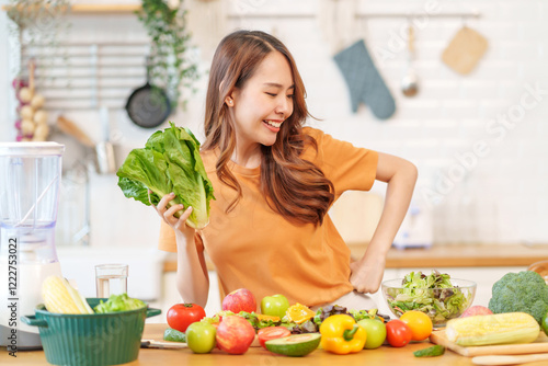 portrait young asian woman having fun in the kitchen,hand holding lettuce for cooking,healthy food,nutrition,vitamin,health