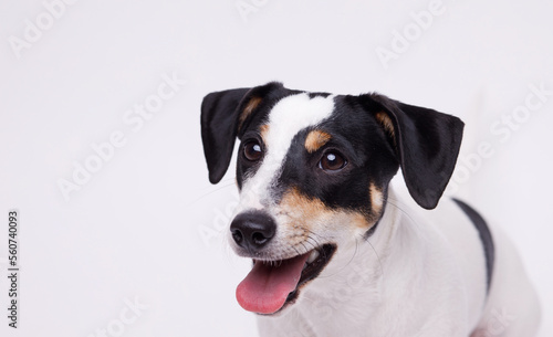 Portraite of adorable, happy puppy of Jack Russell Terrier. Cute smiling dog on white background. Free space for text.