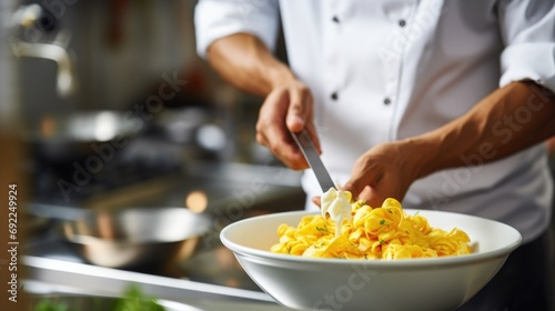 Portuguese Comfort Food Served by Professional Chef: Enjoying the Traditional Dish "Bacalhau à Brás" - Featuring Codfish, Fried Potatoes, and Fresh Parsley.