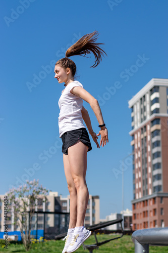 Positive young athletic woman in a white T-shirt,black shorts and white sneakers is jumping.Sports healthy lifestyle.Outdoor training.Urban landscape in the background.Copy space for text.