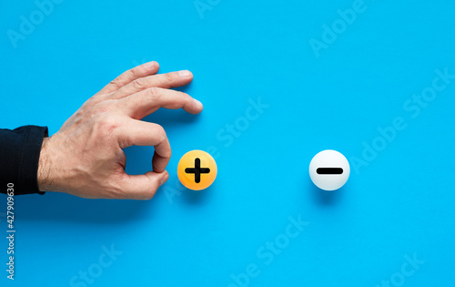 plus, minus, decision, making, positivity, negativity, analysis, business, signs, pro, positive, negative, concept, icon, symbol, pro, defeat, beat, succeed, success, displaced, discard, facet, uncertainty, male, man, hand, flick, con, versus, choose, judge, select, decide, calculation, choice, determination, judgement, action, choosing, solution, strategy, ball, copy space, background, overhead, creative, blue
