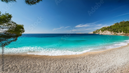 Poster Illustration Of A Serene Beach In The French Riviera With Turquoise Waters Gently Lapping Against A Sandy Beach