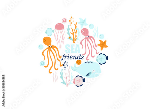 poster of the sea world, vector illustration of fish, whale, jellyfish, squid, stars, seashells, corals
