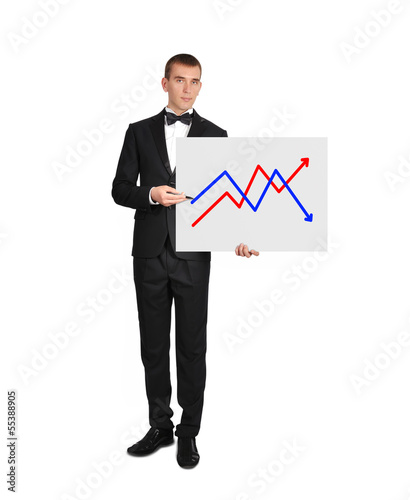 business, businessman, success, progress, caucasian, cheerful, message, people, person, showing, signs, suit, man, male, elegant, young, human, photogenic, man, poster, signs, banner, pen, head, tuxedo, white, graphic, scheme, diagram, graph, chart, profit, up, growth, bar, financial, report, finance, market, paper, drawing