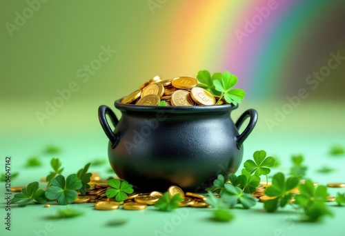 pot, gold, coin, rainbow, clover, luck, wealth, irish, st, patrick, day, celebration, festive, background, banner, poster, card, green, black, yellow, treasure, fortune, holiday, event, party, decoration, magic, mythical, leprechaun, gold, shamrock, spring, march, gift, present, symbol, happiness, joy, prosperity, abundance, success, good, blessing, space, copy space, coin, isolated, money