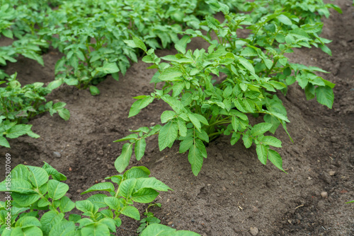 Potato cultivation. Green plantations of new potatoes. Leaves and bushes in close-up.