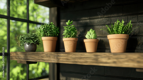 Potted plants on wooden shelf near bright window create serene atmosphere. vibrant greenery adds life and freshness to space, enhancing natural light