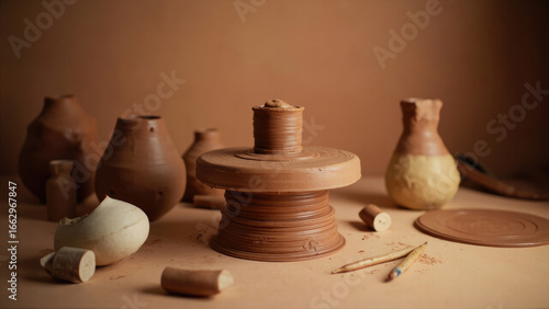 pottery, clay, ceramic, wheel, vase, earthenware, craft, art, studio, workshop, hand-made, brown, beige, tool, ceramic, artistic, creation, process, object, still life, texture, rustic, artisan