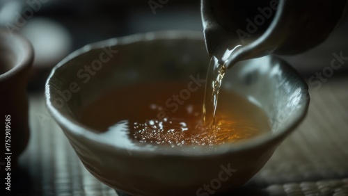 tea, pouring, drink, hot, beverage, liquid, ceramic, bowl, cup, traditional, ceremony, culture, asia, japan, china, calm, relax, serene, peaceful, warm, aroma, fragrance, steam, glowing, gold, amber, transparent, clear, refreshing, healthy, organic, natural, leaf, herbal, green, black, oolong, matcha, infusion, brew, infused, kitchen, table, mat, background, closeup, macro, detail, sharpened