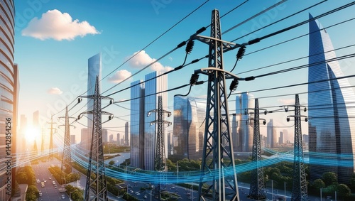 Power lines and transmission towers towering over the city skyline.