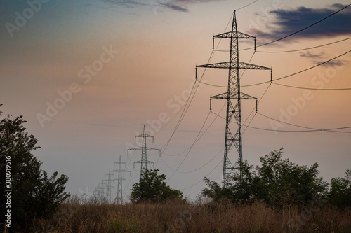 electricity, power, energy, pylon, electric, sunset, tower, sky, cable, line, industry, voltage, powerline, electrical, transmission, high, wire, blue, silhouette, technology, industrial, line, wire, electricity pylon, steel