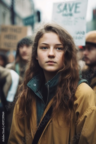 Powerful and inspiring portrait photograph of a young woman protesting against climate change on a busy city street, inspired by photojournalism. Created with generative A.I. technology.