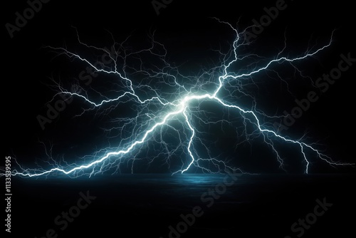Powerful lightning bolt illuminates dark background. Extensive branching shows lightning power. Dark area looks like ground sky. Energy, intensity clear. Photo suitable for tech science topics. Good