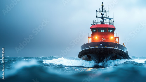 Powerful tugboat navigating through turbulent waters, showcasing its robust design and bright lights against moody sky