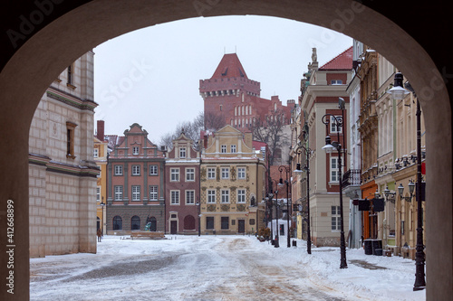 poznan, poland, europa, town, day, square, picturesque, mediaeval, architecture, construction, many-coloured, snow, colourful, travel, tour tourism, facades, baroque, market, old, winter, history, mysterious, fairy, historical, european, snowfall