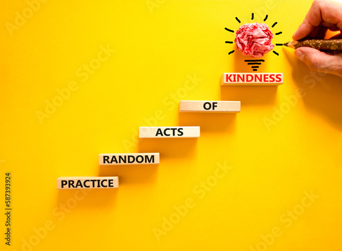 Practice random kind of kindness symbol. Concept words Practice random kind of kindness on wooden block. Beautiful yellow background. Businessman hand. Business practice kindness concept. Copy space.