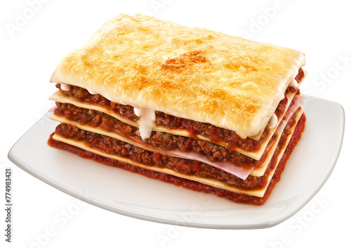prato com lasanha de presunto e queijo com molho bolonhesa isolado em fundo transparente