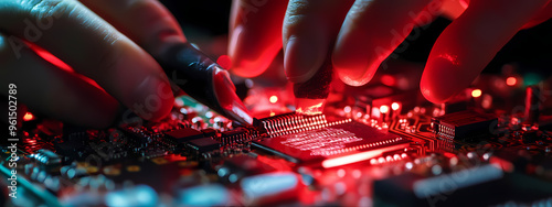 maintenance, circuit, board, hand, closeup, technology, precision, electronic, high technology, red, glow, component, repair, hardware, technical, engineering, tool, wiring, digital, detail, modern, device, innovation, repairing, sharpened, generative, ai, computer, chips, motherboard, electronic, industry, processor, macro, equipment, mainboard, electrical, transistor, semiconductor, blue, card, microchip, central processing unit