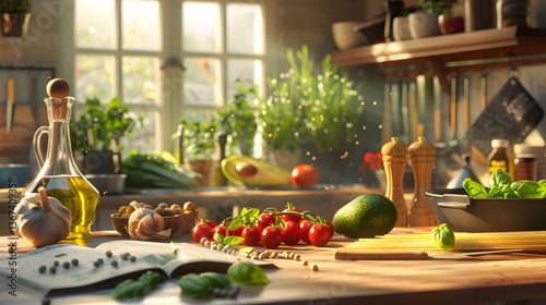 quick, alimentary, meal, healthy, cooking, kitchen, avocado, garlic, olive oil, cherry tomato, basil, spaghetti, cookbook, pan, wooden spoon, chopping board, warm light, home cooking, bricolage, food ingredient, fresh produce, culinary, cookery, homemade, italian cuisine, pasta, vegetarian, vegan, healthy lifestyle, food preparation, food photography, dinner, lunch