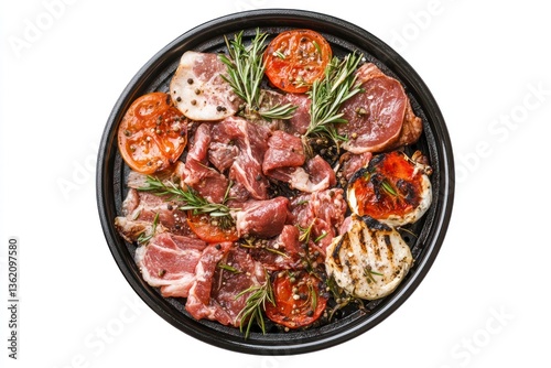 meat, preparing, grill, tomatoes, rosemary, herb, vegetable, chunk, raw, black pepper, spice, seasoning, food, ingredient, cooking, eating, nourishment, cookery, dinner, lunch, bar-b-q, grilling, culinary, plate, round, topview, still life, studio shot, white background, isolated, fresh, health care, lifestyle, overhead, meal, preparation, receipe, gastronomy