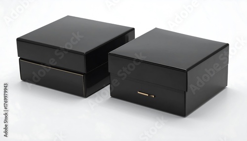 Presents showcases. Stylish black boxes sit on white background. Minimalist design. Use for gifting, jewelry, packaging, product display, luxury brands, marketing.