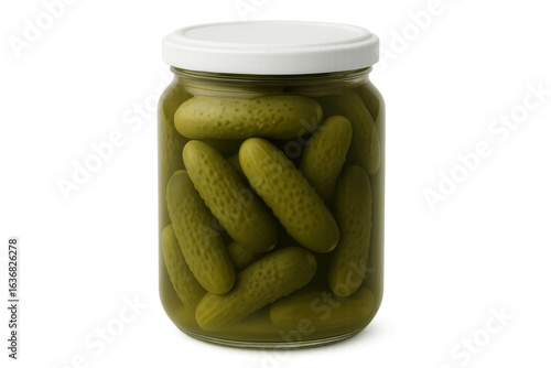 Preserved gherkins nestled inside glass jar, white lid secured, transparent background highlighting crisp pickled vegetables