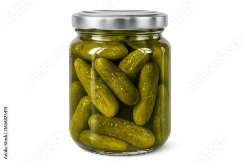 Preserved gherkins stored in glass jar, metal lid securing crisp pickled cucumbers against transparent background
