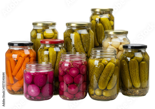pickle, jar, preserved, food, vegetable, glasses, cucumber, canned, homemade, pickled, variety, assortment, still life, epicure, transparent, background, isolated, collection, arrangement, tasty, delicious, natural, organic, healthy, diet, vegan, vegetarian, colourful, onion, carrot, beetroot, gherkins, snack, condiment, cookery, receipe, traditional, culinary, ingredient, rustic, country, style, vibrant, display, stack, closeup, studio shot