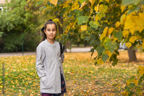 Preteen girl child with backpack outdoors. Pretty schoolgirl going home after class