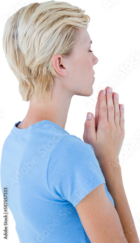 one person, young adult, woman, female, caucasian, cut-out, isolated, casual clothes, fair hair, blond, light hair, short hair, praying, prayer, pray, eyes closed, christianity, catholic, studio shot