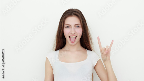 Pretty funny young girl showing tongue and rock gesture
