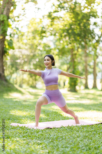 Pretty slim perfect body asian women wear sportswear to playing basic yoga compose.
